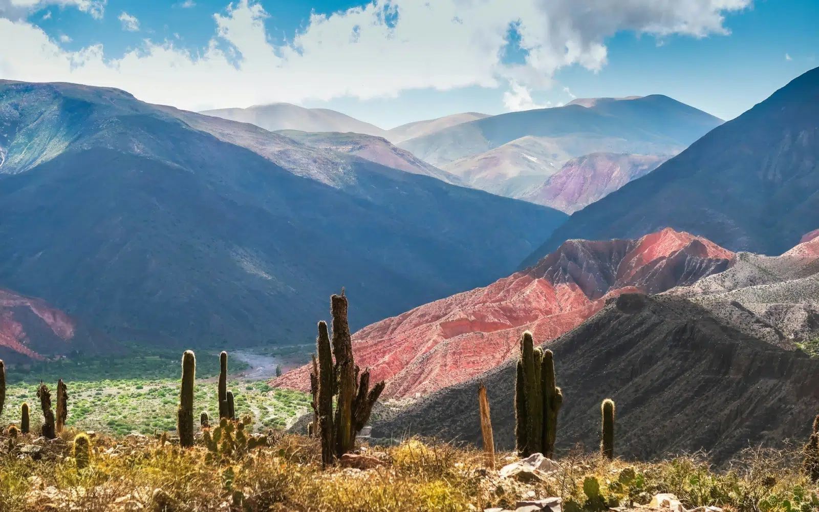 Première escale dans le charmant village de Purmamarca, posé au pied de la célèbre Colline aux Sept Couleurs. Ce paysage géologique unique ressemble à une toile vivante où s’entrelacent les tons ocre, vert, rose, violet…