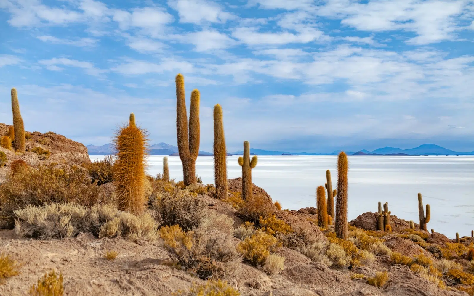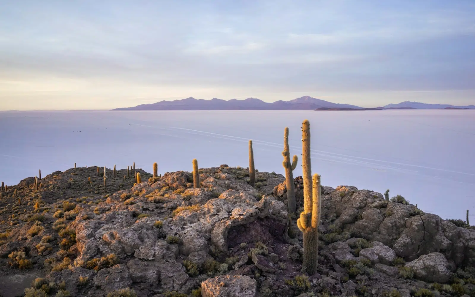 Vous explorez les étonnants “Ojos del Salar”, les sites d’extraction, ainsi que des sculptures de sel uniques telles que “La Main de Dieu” ou “Les Escaliers vers le Ciel”, avant de vous aventurer dans un fascinant labyrinthe de sel. Poursuivez vers la Place des Drapeaux et les îles Incahuasi et Pia Pia. À pied, déambulez à travers les cactus candélabres géants et des coraux fossilisés millénaires.