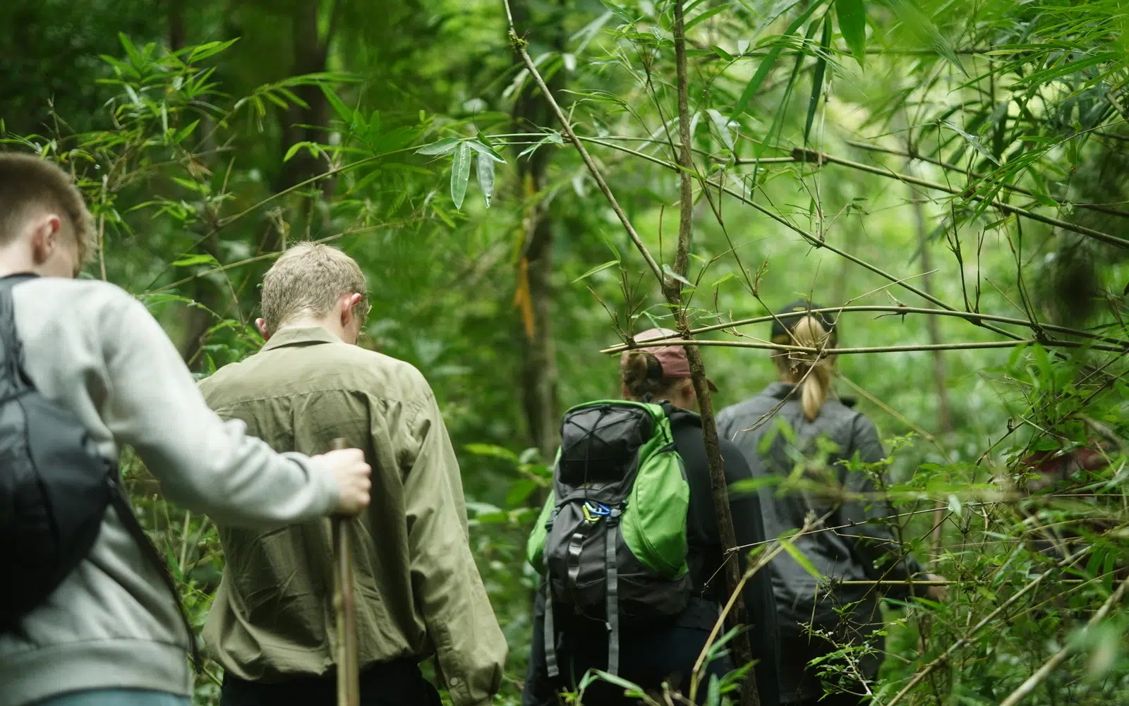 Vous quittez le camp à pied, sac sur le dos, et entamez une randonnée de quelques heures à travers la forêt luxuriante. La lumière filtre à travers la canopée, le sol est tapissé de feuilles humides, et parfois, une trouée offre une vue saisissante sur les collines karen.