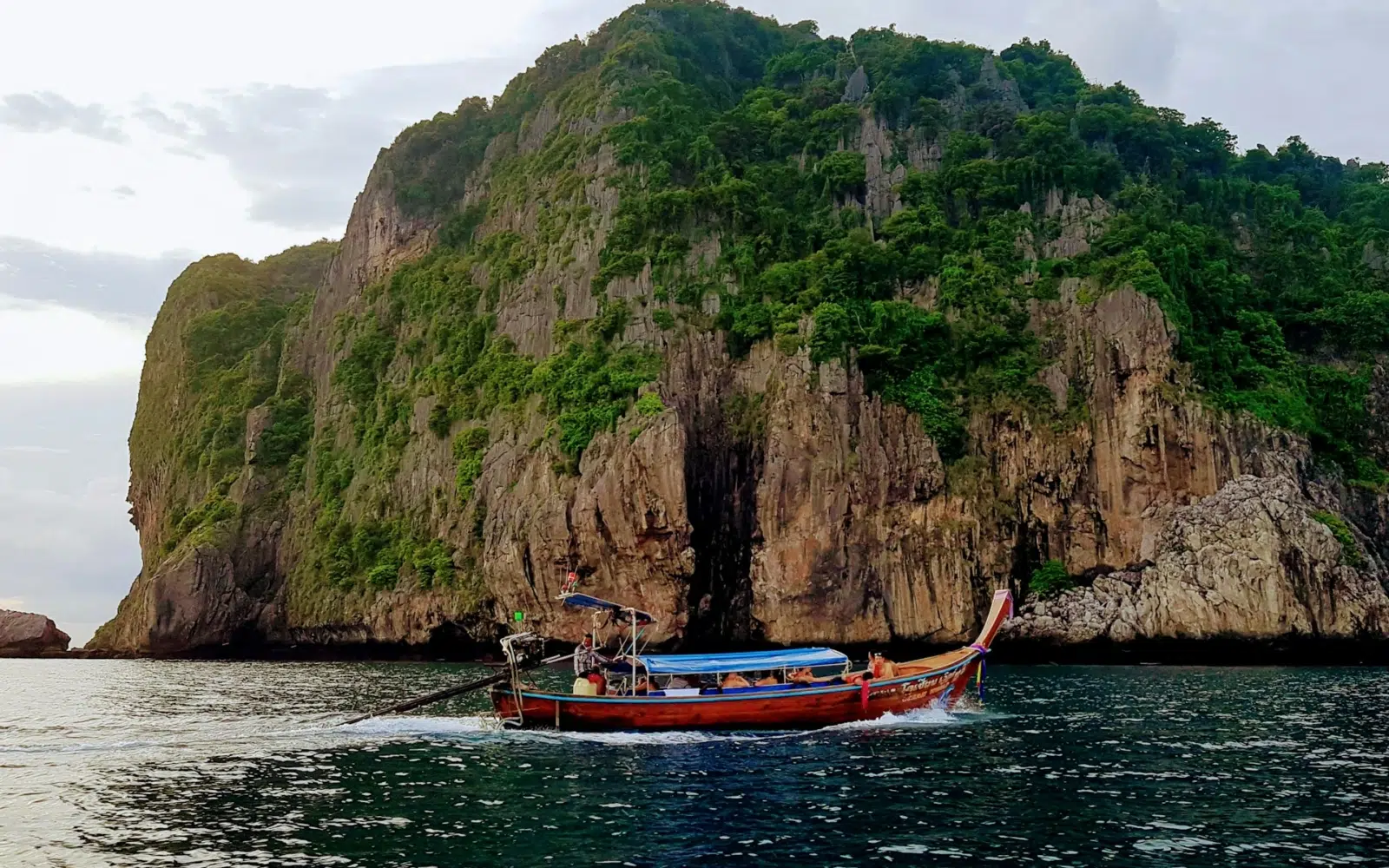 Le bateau marque d’abord un arrêt à Tonsai Bay, principal point d’arrivée des voyageurs, niché entre deux falaises spectaculaires. Vous restez à bord et poursuivez votre route vers le nord de l’île, jusqu’à Laem Tong, plus préservée et intimiste.
