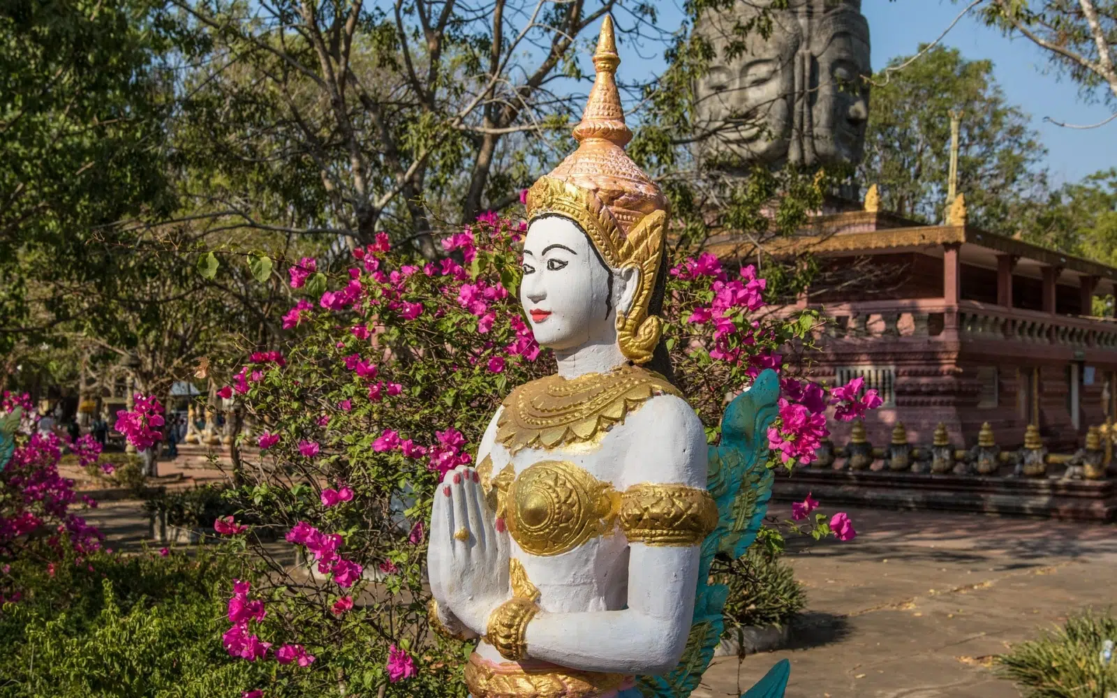 Notre matinée débute au Palais Royal, symbole de la monarchie cambodgienne. Derrière ses murs immaculés s’élèvent toits vernissés, fresques mythologiques et jardins soignés. Dans la pagode d’Argent, l’or, le cristal et la sérénité se rencontrent autour du Bouddha d’émeraude. L’ensemble, harmonieux et sacré, donne au visiteur un sentiment d’apaisement et de solennité. Non loin de là, le Musée National déploie les trésors de l’art khmer : sculptures de grès, bas-reliefs délicats et divinités intemporelles veillent sur le passé du royaume.