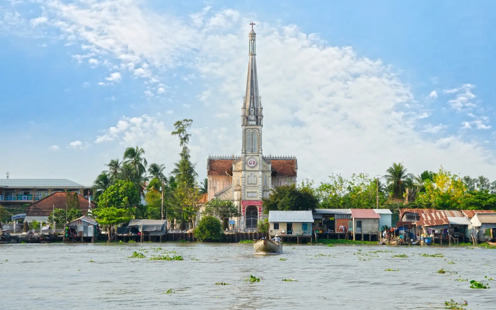 Avant le retour à bord, le bateau longe la cathédrale gothique de Cai Be, dont la silhouette tranche avec la végétation tropicale environnante. Puis, rencontre avec une famille qui perpétue la fabrication artisanale de feuilles de riz et de friandises à base de noix de coco – gestes précis, secrets bien gardés.