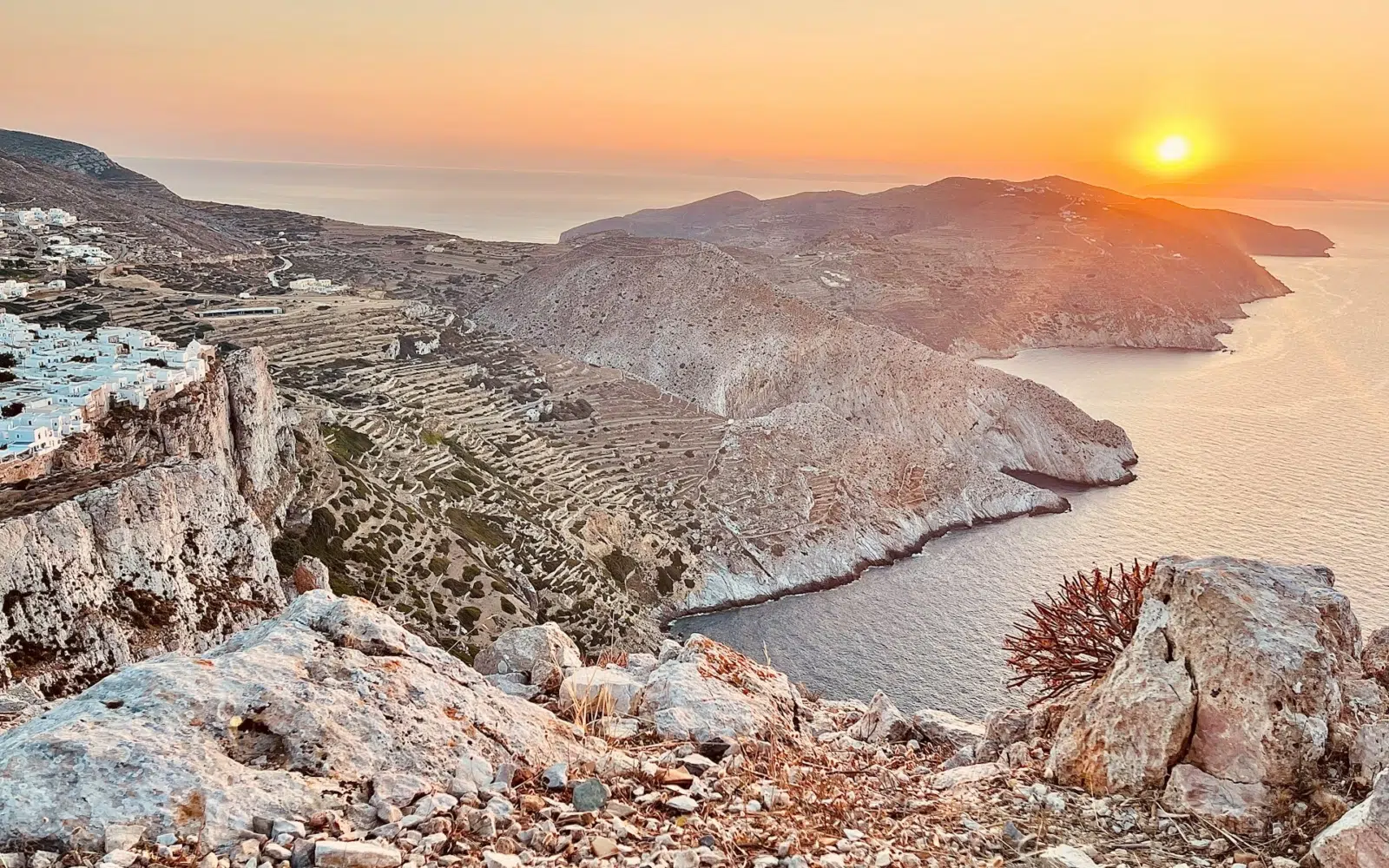 Folegandros déploie une étonnante diversité de paysages sur un petit territoire : des plaines ouvertes succèdent à des collines en terrasses, des falaises abruptes surplombent des plages confidentielles, et des éperons rocheux se découpent dans le ciel. À vous l’exploration !