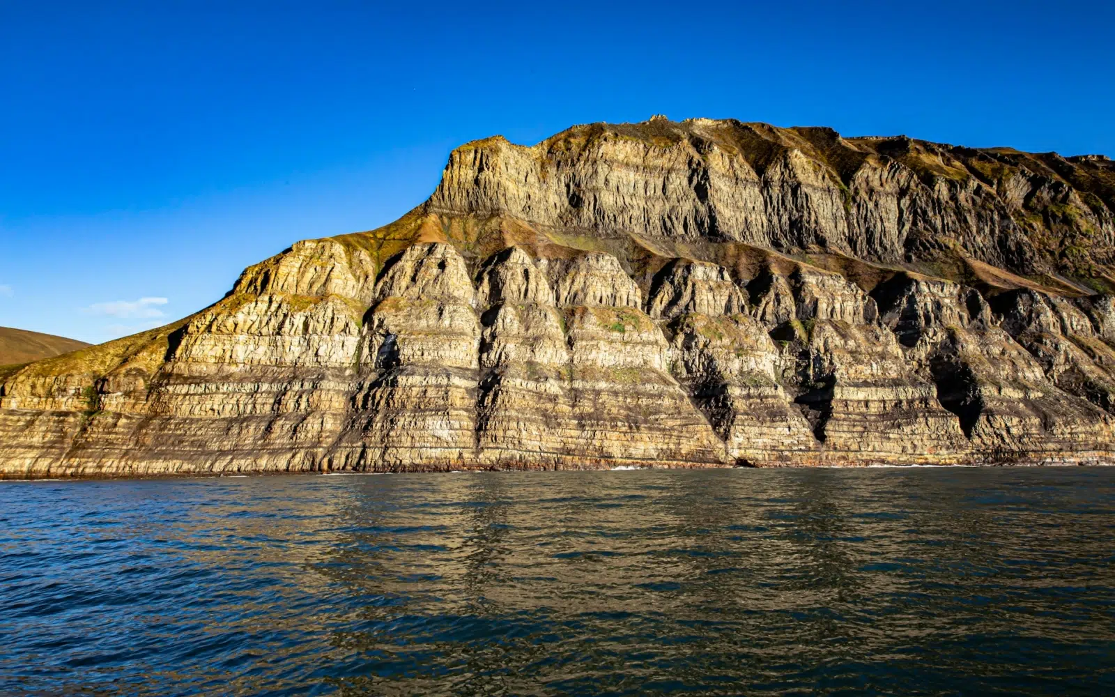 L’Exploris One met ensuite le cap vers la baie de la Croix. Là, une sortie en bateau pneumatique est prévue le long des glaciers. Sur les versants montagneux, la floraison bat son plein, peignant la toundra de couleurs vives. Les renards arctiques guettent, furtifs, autour des falaises peuplées de mouettes tridactyles et de guillemots de Brünnich.
