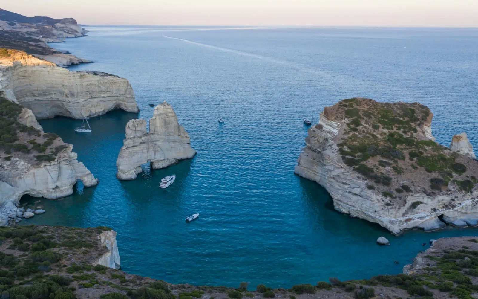 Au petit matin, le voilier approche de Milos. Premier émerveillement : Sarakiniko, ses crêtes de roche blanche sculptées par le vent et la mer, évoquent un paysage lunaire suspendu entre ciel et sel. Puis vient l’escale, sur cette île tranquille où le temps semble s’être ralenti.